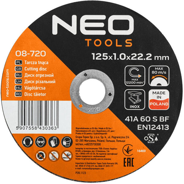 NEO vágókorong fémhez, 41 A 60 S BF -125 x 1,0 x 22,2 STAHL/INOX, 25 darabos csomagban . A 41 A 60 S BF vágókorongokat 125 mm átmérő, 1 mm vastagság és 22,2 mm-es rögzítőfurat jellemzi. Max. fordulatszám: 12 200/perc. Ajánlott acélhoz, rozsdamentes acélhoz . Ideális mind professzionális, mind hobbiszerű használatra.
