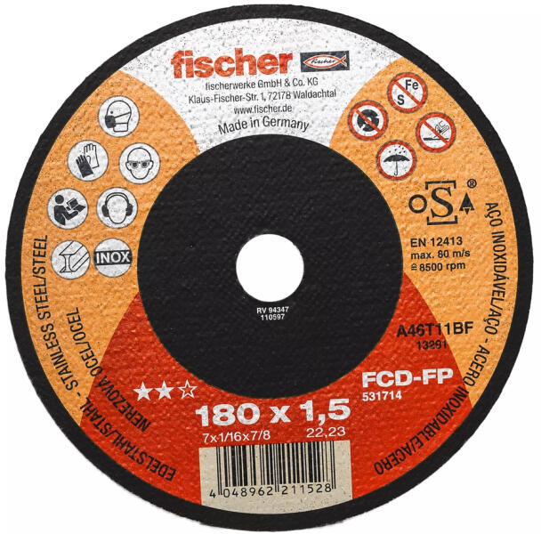 FISCHER FCD-FP 180x1,5x22,23 plus Vágókorong (531714) Terméki nformáció: Az FCD-FP fischer vágókorong egy fémvágó korong alacsony fordulatszámú sarokcsiszolókkal történő alkalmazáshoz. A vas- és kénmentes vágókorong ideális normál- és korrózióálló acél vágásához. Különösen vékony falú anyagoknál garantált a hosszú élettartam és a megbízható vágási kép