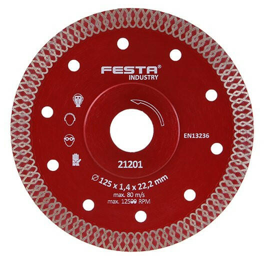 A termék leírása: FESTA INDUSTRY Professzionális gyémánt vágó korong. Kivitel: - teljes kerületű, kiváló minőségű gyémántréteg magas gyémántpor tartalommal és precíz megmunkálással. Csatlakozás a vágótárcsához magas hőmérségletnek ellenálló, hűtőfuratok vannak a pengetestben a maximális hűtéshez. A szegmenseknek speciális formája van a nagyon gyors vágás