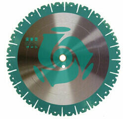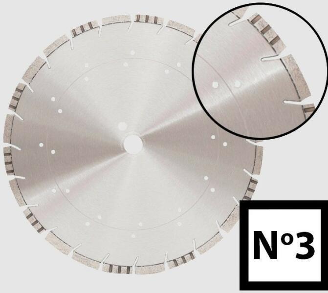 Gyémánttárcsa No. 3 Három fajta szegmenstípus kombinációjaHűtési lyukak az alaplaponBeton, asztfalt, gránit vágásáhozHasználata vizes üzemmódbanSzegmensmagasság: 10 mm