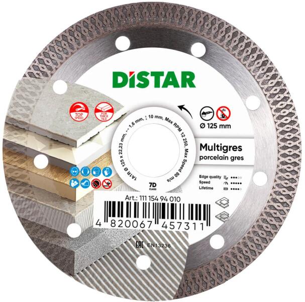 A DISTAR MULTIGRES gyémánt korong legfeljebb 20 mm vastagságú gránit-kerámia agyagok feldolgozására készült. Megbirkózik a kerámia és márvány vágásával is. Normál illesztési átmérője 22,23 mm, így bármilyen Ø125 mm sarokcsiszolón használható. A DISTAR MULTIGRES ultra vékony korong, gyémánt rétege 10 mm magas és 1,4 mm vastag, ami a lehető legeredményesebbé tesz