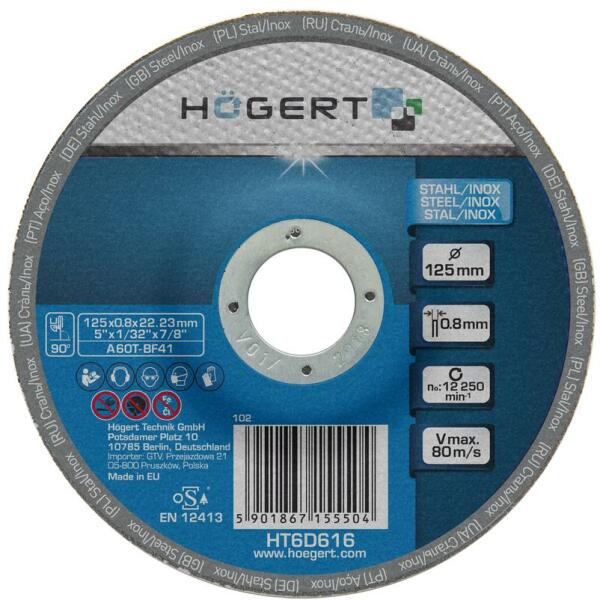 HÖGERT Vágókorong (fémhez / inoxhoz), 125 x 0,8 x 22,23 mm (HT6D616) Termék információ: Anyaga : Korundszemcsék Méret: 125mm/0,8mm/22,23mm Kiváló minőségű korundszemcsékből készült tárcsa Sarokcsiszolókhoz alkalmazható Üzemi sebesség 80m/mp Ajánlott fémlemez és egyéb anyagok vágására, amikor fontos a minimális anyagveszteség Vágási sebesség és tárcsa tartóssá