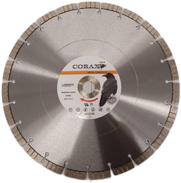 A Corax Prémium Laser Turbo egyedi lézerhegesztett gyémánt vágókorong, sokféle anyaghoz használható. A korszerű kialakításnak köszönhetően a tárcsa rendkívüli vágási sebességet, garantált vágási pontosságot és nagyon hosszú szerszám élettartamot kínál. Nagyon jó ár-érték arány száraz és nedves vágáshoz. Felhasználási terület: Beton, vasalt beton, térkő,