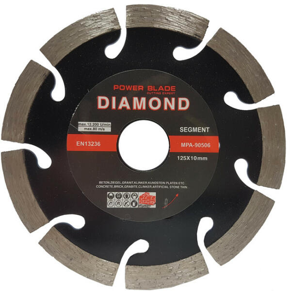 Gyémánt korong SEGMENT 125mm x 10mm x 22,2mmGyémántkorong 125mm-es külső átmérővel építőanyagok vasbeton, tégla, kerámia, gránit, kőanyag, márvány csiszolására. A korong nikkel-acélból készült réz hozzáadásával, amely növeli az ellenállást a szakadással szemben és lehetővé teszi 80 m/s-os sebesség elérését is. Technikai paraméterek:Külső átmérő: 125mmBe