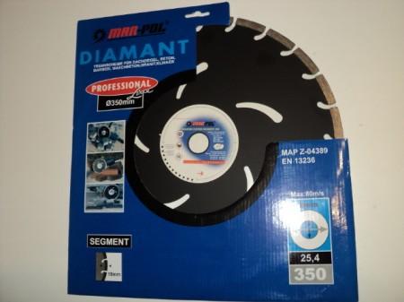 Mar-Pol M08738 gyémántvágó korong szegmenses 350mm Gyémánt korong kemény anyagok vágására, például: megszilárdult beton, tégla, gránit, fal, kő. Száraz vágáshoz használható. A korong szegmentált éllel rendelkezik, amely megkönnyíti a vágás során keletkezett hulladék eltávolítását és könnyű kezelhetőséget biztosít a kemény, agresszív felületeken. Külső á