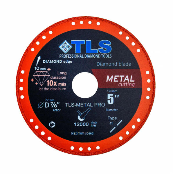 TLS METAL-PRO-1 gyémántszemcsés vágókorong fémekhez és általános vágási célokhoz Átmérő: d=125 mm Furatátmérő: d=22.23 mm Vágószegmens magasság : 10 mm Vágó szegmens vastagság: 1.2/2.2 mm Alkalmazás: száraz Alkalmazási terület: szögvas, betonacél lemez, betonacél, koracél, alumínium, rozsdamentes acél, gránit, beton, kemény műanyagok, fa, márvány, acél, fém