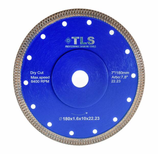 TLS X-PRO TURBO ultravékony gyémánt vágókorong Átmérő: d=180 mm Furatátmérő: 25,4/22,23 mm Vágószegmens magasság : 10 mm Vágó szegmens vastagság: 1.6 mm Alkalmazás: száraz és vizes használat Alkalmazási terület: Gres, kőporcelán, kemény kerámiák, gránit, márvány, csempe, kemény anyagok, tégla, egyéb építőipari anyagok, stb. TLS X-PRO TURBO ULTRAVÉKONY GYÉMÁN