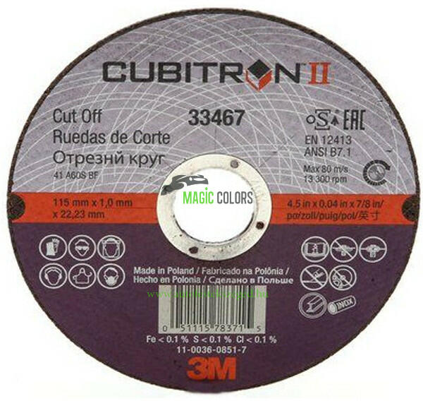 3M Cubitron II Vágókorong (115 x 22,23 mm) – Prémium vágókorong nagy szilárdságú acélok, rozsdamentes és enyhe acél vágásához. Hosszú élettartam és gyors vágóteljesítmény, a hatékonyság növelésére. 3M Cubitron II Vágókorong (115 x 22,23 mm) A 3M Cubitron II Vágókorong ideális választás a műhely hatékonyságának növelésére. A merev, erősített gyanta köté