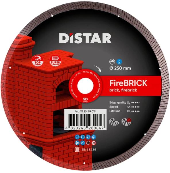 Gyémánt vágókorong DISTAR tűzálló téglák vágására tervezték. Átmérő: 250 mm; középfurat: 25,4 mm; szegmensvastagság: 1,9 mm; nedves vágás. Ref: 11120159015