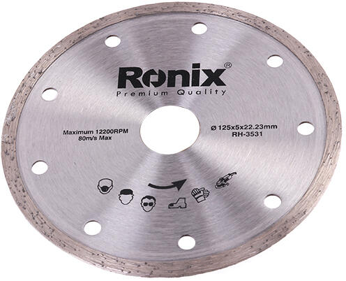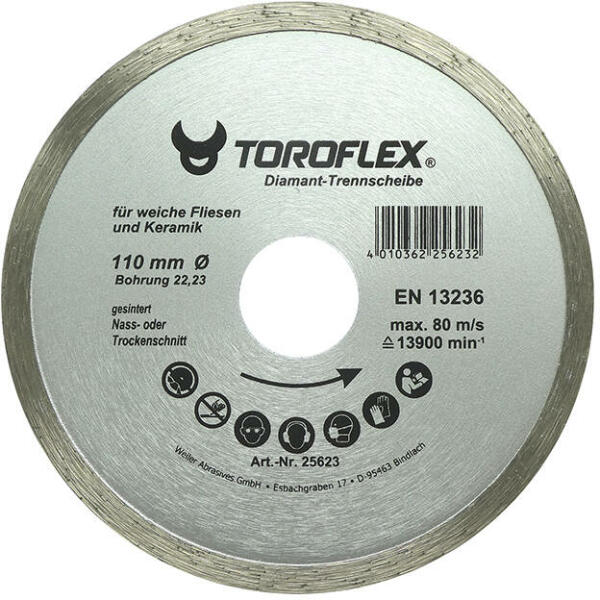 Szinterezett, folyamatos vágóéllel ellátott gyémánttárcsa Burkolóanyagok vágására sarokcsiszoló gépekkel vagy asztali csempevágó gépekkel: burkolólap; járólap; csempe Cikkszámtárcsa ø (mm)furat ø (mm)szegmensmagasság (mm)kerületi sebesség (m/s)max. ford. (1/min)010301-007811022,2SH5,58013890