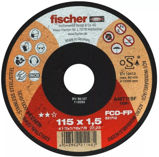 FISCHER FCD-FP 115 x 1,5 x 22,23 plus Vágókorong (531710) Terméki nformáció: Az FCD-FP fischer vágókorong egy fémvágó korong alacsony fordulatszámú sarokcsiszolókkal történő alkalmazáshoz. A vas- és kénmentes vágókorong ideális normál- és korrózióálló acél vágásához. Különösen vékony falú anyagoknál garantált a hosszú élettartam és a megbízható vágási