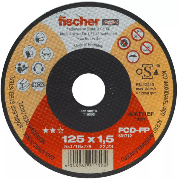 FISCHER FCD-FP 125 x 1,5 x 22,23 plus Vágókorong (531712) Terméki nformáció: Az FCD-FP fischer vágókorong egy fémvágó korong alacsony fordulatszámú sarokcsiszolókkal történő alkalmazáshoz. A vas- és kénmentes vágókorong ideális normál- és korrózióálló acél vágásához. Különösen vékony falú anyagoknál garantált a hosszú élettartam és a megbízható vágási