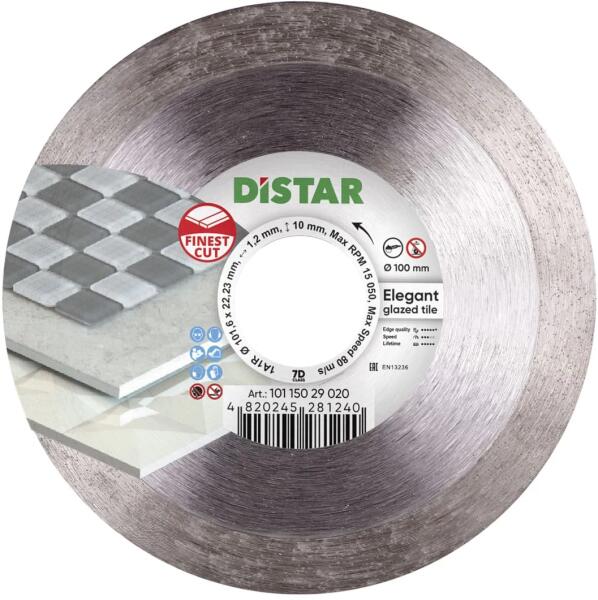 DISTAR gyémánt vágókorong Ø 100 mm. Befejező munkákhoz, mázas csempékhez tervezték, nagyon jó minőségű vágással rendelkezik. Átmérő: 100 mm; Középfurat: 22,23 mm; Szegmensvastagság: 1,2 mm; Száraz vágás. Ref: 10115029020