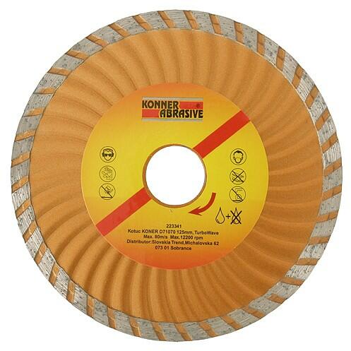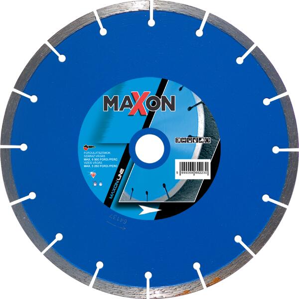 Nagy teljesítményű szegmentált gyémántvágótárcsa, építőanyagokban történő vágáshoz Lézerhegesztésű gyémánt vágószegmensekkel Építési anyagok száraz vágására ajánlott sarokcsiszoló gépekkel (230mm-ig), asztali és robbanómotoros vágógépekkel (300mm-től): gránit; beton; vasbeton; kaviccsal szórt, mosott felületű beton; kemény klinker cikkszámtárcsa ø (m
