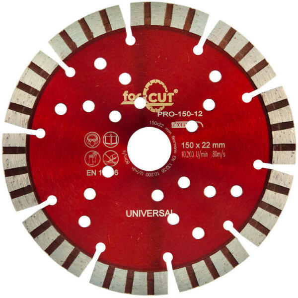ABRABORO Univerzális, gyémántszemcsés vágókorong No. 11 Prémium minőség Lézerhegesztett univerzális vágótárcsa szinte minden építőipari anyag vágásához A speciálisan fogazott szegmensek és a turbo vágóél gyors, tiszta munkát biztosít Hhűtési lyukak az alaplapon Száraz és vizes vágáshoz egyaránt ajánlott Szegmensmagasság: 15 mm