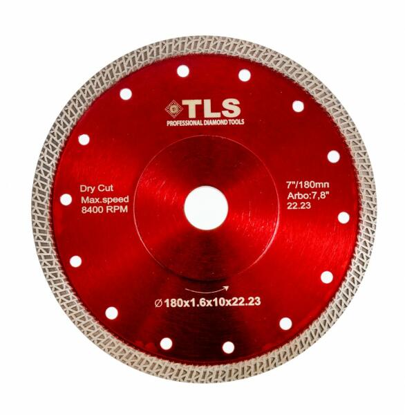 TLS K-PRO TURBO ultravékony gyémánt vágókorong Átmérő: d=180 mm Furatátmérő: d=25,4/22,23 mm Vágószegmens magasság : 10 mm Vágó szegmens vastagság: 1.6 mm Alkalmazás: száraz és vizes használat Alkalmazási terület: Gres, kőporcelán, kemény kerámiák, gránit, márvány, csempe, kemény anyagok, tégla, egyéb építőipari anyagok, stb. TLS K-PRO TURBO ULTRAVÉKONY GYÉM