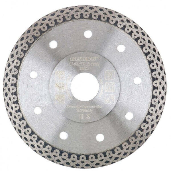 vízhűtésesátmérő: 125 mmvastagság: 1.2 mmfurat átmérő: 22.2 mmvágórész szélesség: 10 mmfelhasználás: kő, porcelán, csempe, márványEAN kód: 4044996119465