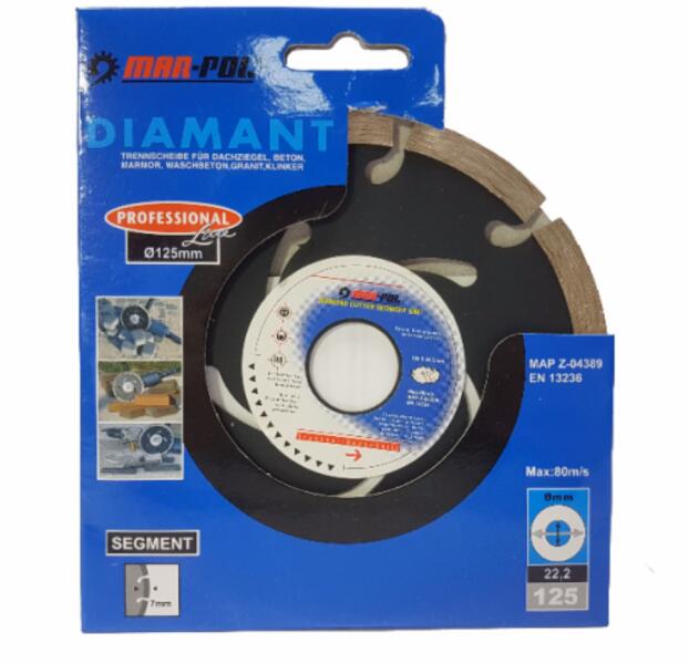 építoanyag (beton, tégla, térburkoló kövek, gázbeton, kerámia) hosszabb élettartam köszönhetoen az új gyártási technológiának. . átméro 125 mm . furat átméro 22,2mm . vágóél magassága 7 mm