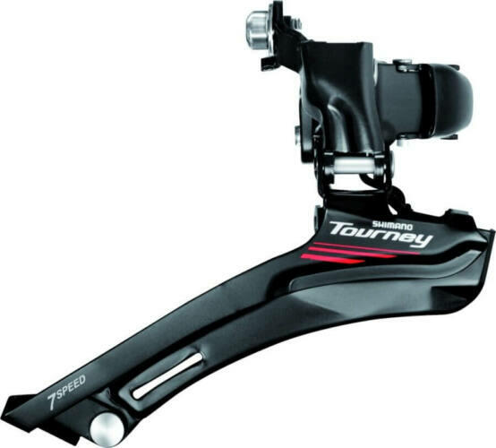 Shimano Tourney FD-A070A országúti első váltó, felső bilincses, 2x7sBelépő kategóriás, 7 sebességes országúti kerékpárokhoz való első váltó, dupla rendszerhez 2x7 fokozattal kompatibilis 34,9 mm-es bilinccsel, mely a mellékelt átalakítókkal 31,8-ra vagy 28,6-ra csökkenthető Alapanyag: acél Láncfelvevő kapacitás: 16 fog Legnagyobb lánctányér: 50 fog Láncvonal: 43,5