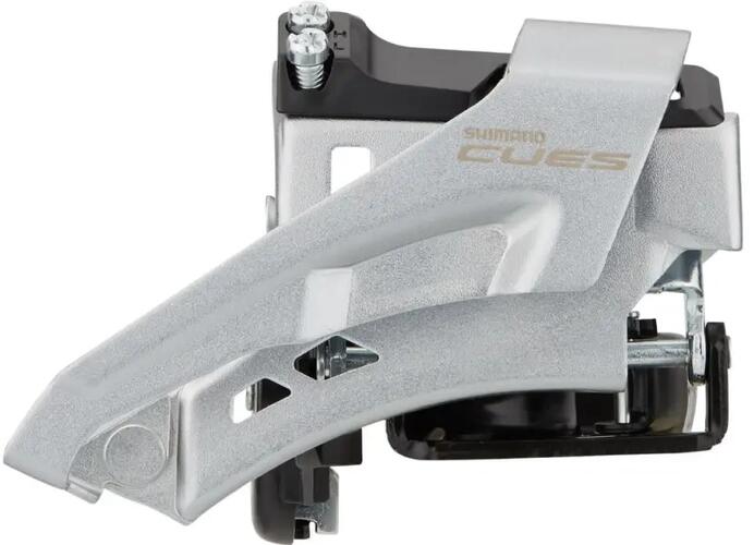 Shimano Cues FD-U4000-L Linkglide első váltó, AH-FH, alsó bilincses (Top Swing), 2x9s, 2x10s, 40TA Shimano Cues teljesen új középkategóriás váltórendszer, mely a korábbi Acera, Altus, Alivio rendszereket váltja fel teljes mértékben. Kapható 2x9, 2x10 és 2x11 sebességes változatban is. A korábbihoz képest háromszoros élettartam, nagyobb váltási pontosság és egyszerűség