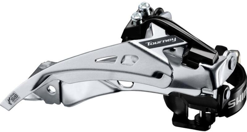 Shimano Tourney FD-TY710 trekking első váltó, AH-FH 48T, alsó bilincses, 3x7-8sKedvező árú első váltó trekking bringákra Kompatibilis sebességi fokozatok: 3x7-8s Bilincs méret: 34,9 mm, mely tartozék adapterrel 31,8 vagy 28,6 mm-re szűkíthető AH-FH: Alsó vagy felső bowdenhúzáshoz is Láncvonal: 47,5-50 mm Láncvilla-szög: 63-66°(trekking) Max fogszám: 48 fog Maximális kapa