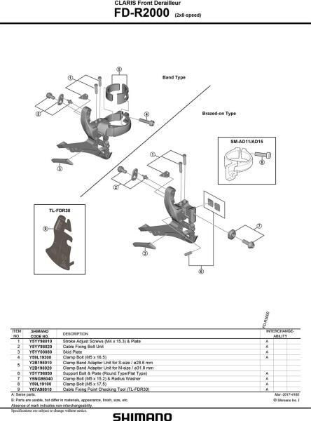 Első váltó országúti kerékpárokhoz. Bilincses rögzítésű. 46-52 fogszámhoz. Teljes fogszám kapacitás: 16 fog. Sebesség: 8, 2. Láncvonal: 43.5 mm. Láncvonal szög: 61-66 fok.