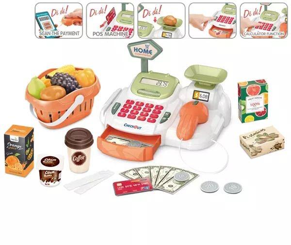 Játék pénztárgép sok kiegészítővel, mint a vonalkódolvasó, pénzérme, bankjegyek, különböző gyümölcsök és egyéb áruk. Anyaga: Műanyag Mérete: 37x16x12 cm