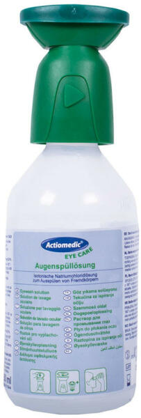 Actiomedic elsősegély szemkimosó folyadék Steril szemkimosó palack 0.9%-os nátrium-klorid oldattal, idegen testek, pl. fa- és fémforgácsok, por, szennyeződések kiöblítésére. Ergonomikus öblítőfejjel és porvédővel. Mobil használatra vagy állomások és tartók feltöltésére is. Öblítési idő: kb. 2,5 perc. A flakon teljes tartalmát el kell használni a szemöblítésre.