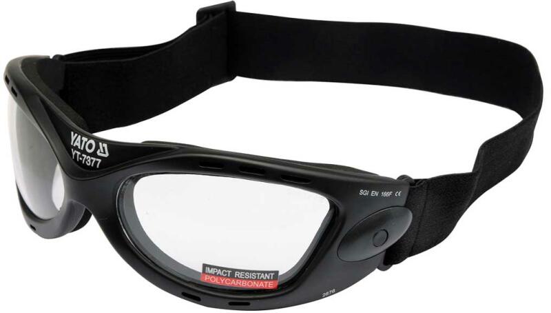 YT-7369 modern kialakítású védőszemüveg, amely a szem védelmére szolgál kézi és gépi munkáknál, pl. csiszolás, fúrás, vésés stb. esetén. optikai osztály: 1 - a legmagasabb látásminőség, folyamatos munkához ajánlott lencse anyaga: polikarbonát keret anyaga: polikarbonát orrpárnák puha gumival borított karvégek, amelyek megakadályozzák a szemüveg véletlen elcsús