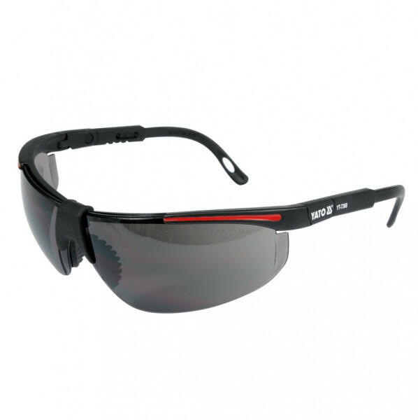 A YATO védőszemüveg füstszínű üveggel készül, optikai besorolása I. osztályú (megfelel az EN166 és EN172 követelményeknek). A polikarbonátból készülő szárak állítható hosszúságúak és védelmet nyújtanak oldalirányból, és végein lévő lyukakba nyakzsinór helyezhető. A lencse 5-3,1-es napfény elleni védett üveg. A védőszemüveg maximális védelmet nyújt a 8
