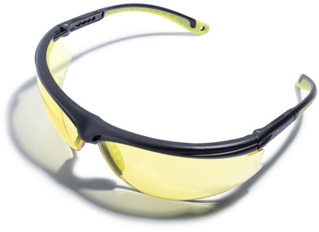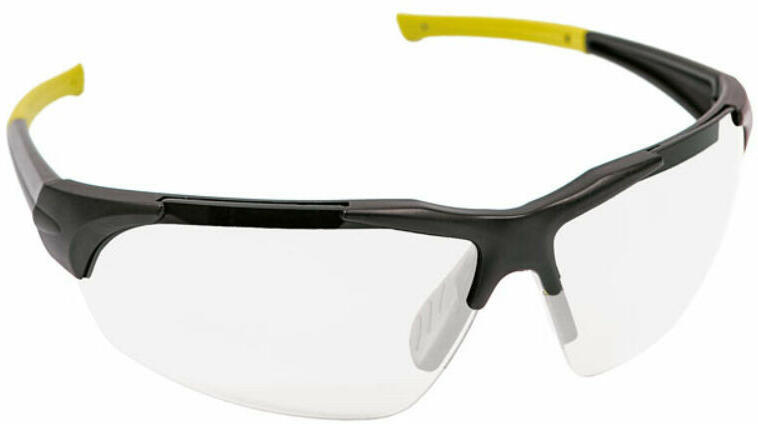 Funkcionális biztonsági szemüveg többféle lencseváltozattal. Polikarbonát lencse. Állítható oldalsó részek kemény és puha műanyag keverékéből. Puha orrhíd. Tiszta, sárga, narancssárga vagy szürke lencse. Tiszta, sárga, narancssárga = UV-védelem. Szürke = UV400. HC = Karcálló lencse. HC / AF = karcálló és páramentes lencse. Megfelel az EN 166 szabványnak, 1F (HC) os