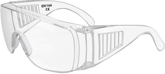 Munkavédelmi szemüveg, átlátszó Munkavédelmi szemüveg ellenálló polikarbonátból. A szemüveg védi a szemet felpattanó forgácstól fa, fém, kerámia és műanyag megmunkálásánál. Az ellenálló műanyagkeret és a kiszélesített üveg biztosítják az optimális szemvédelmet. Állítható pánthosszal és átlátszó üveggel. Technikai paraméterek:Optikai osztály: 1Védelmi