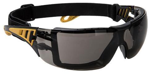 Füstszínű, gumipántos zárt védőszemüveg Füstszínű polikarbonát zárt szemüveg. Indirekt szellőzéssel. Lágy PVC és nejlon keret. Visszatükröződés mentes panoráma látómező. Látásjavító szemüveggel és korlátozott használatú légzésvédő félálarccal együtt is viselhető. Alapanyag: PVC, Polikarbonát A termék megfelel a EN166 szabványnak. Dönthető gumipánt a