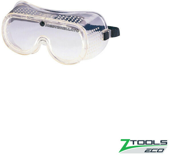 Univerzális zárt védőszemüveg Víztiszta lencse EN 166 szabvány Védelmet nyújt a szemnek a kisebb és közepes méretű, repülő tárgyakkal és kifröccsenő folyadékokkal szemben. Erősített mechanikai védelemmel ellátott víztiszta polikarbonát lencse. Szár nélkül állítható, latex gumi pántos rögzítés. Szellőzőlyukakkal ellátott puha keret.