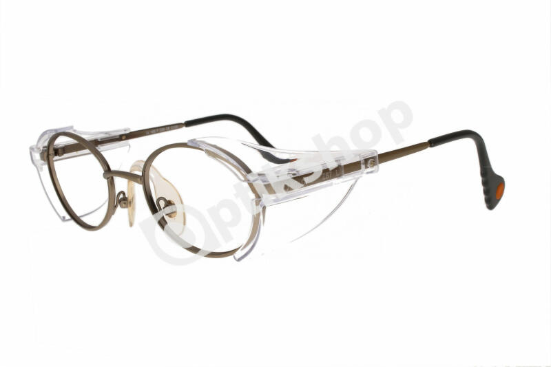 Fém arany színű, dioptriázható védőszemüveg átlátszó, oldalsó védelemmel ellátva. Szára arany színű, szárvége szürke műanyag, narancssárga puha párnázattal a sarkában, melyen a márkanév kapott helyet. Ezek a munka szemüvegek minden területen kiváló védelmet nyújtanak.