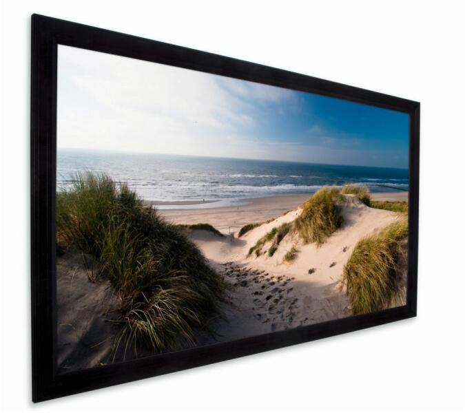 Adeo Plano 200x112 fix keretes vetítővászon 16:9 Az Adeo Plano termékcsalád olyan vetítővásznakból áll, amelyek egyaránt praktikusak és designosak. Esztétikus fix kerettel rendelkezik, amit úgy terveztek, hogy meggátolja a zavaró fényvisszaverődést. A keret színe fekete, anyaga alumínium, szélessége 8,5 cm. A feszítést rugalmas kábelek biztosítják, amelyek garantálják