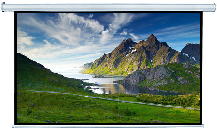 MEDIUM MOTOROS VETÍTŐVÁSZON 186×105 CM 16:9 – Falra vagy mennyezetre rögzíthető: két csavarral egyszerűen oldalfalra vagy a mennyezetre szerelhető. – Modern fehér 4 szögletű vékony fehér tokozat – Többféle képarány: válasszon a projektorához illeszkedő 4:3, 16:10, 16:9 képarányú vásznak közül. – Csendes szinkronmotor: hosszú élettartam, diszkrét működés