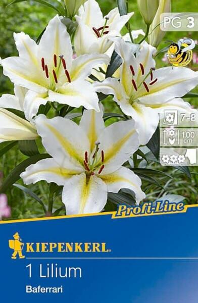 Lilium Baferrari liliom virághagyma Virághagyma körmérete: 16/18 cm Javasolt ültetési ideje: tavasz Növény várható magassága: 100 cm Virágzás ideje: 7-8 hó Vágott virágnak is alkalmas Illatos