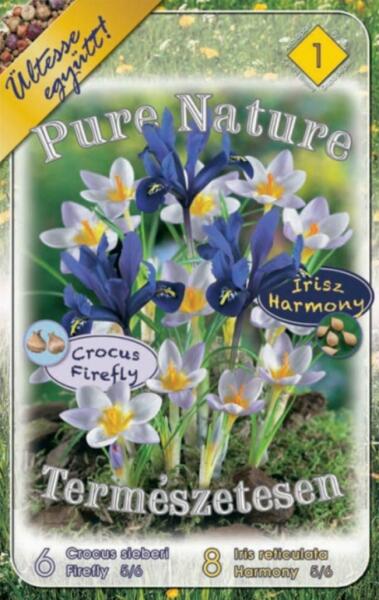Pure Nature Crocus Firefly + Irisz Harmony virághagyma összeállítás Csomag tartalma: 6 db Crocus sieberi Firefly 5/6 cm-es krókusz virághagyma 8 db Iris reticulata Harmony 5/6 cm-es írisz virághagyma Növények várható magassága: 10 cm Javasolt ültetési ideje: szeptember-december Javasolt ültetési távolság: 8 cm Javasolt ültetési mélység: 8 cm Virágzás ideje: február-márc