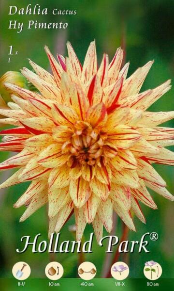 Dahlia Cactus Hy Pimento kaktusz dália gumó 1' Javasolt ültetési ideje: III. -V. Virágzás ideje: VII. -X. Javasolt ültetési távolság: 60 cm Javasolt ültetési mélység kb. : 8 cm Növény várható magassága kb. : 90 cm Termesztett állományból származó növény. Származási hely: EU Kiültetés elõtt a gumókat - megjelölve, hogy melyik-melyik - virágzás segítõként és ha