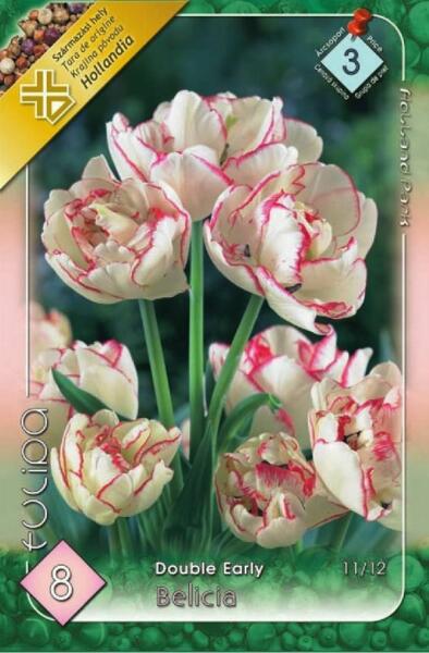 Tulipa Double Early Belicia Tulipán virághagymák Javasolt ültetési ideje: Szeptember- December Virágzás ideje: Április Javasolt ültetési távolság: 10 cm Javasolt ültetési mélység kb. : 10 cm Növény várható magassága kb. : 40 cm Termesztett állományból származó növény. Származási hely: EU Ezek a korai virágzású tulipánok már áprilisban nyílnak és különösen a