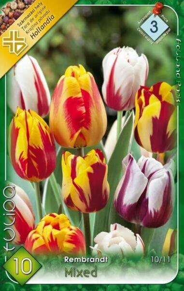 Tulipa Rembrandt Mixed vegyes tulipán virághagymák 3' Virághagyma körmérete: 10/11 cm Javasolt ültetési ideje: Szeptember - December Virágzás ideje:Április Javasolt ültetési távolság: 10 cm Javasolt ültetési mélység kb. : 10 cm Növény várható magassága kb. : 50 cm A Rembrandt tulipánok 50-60 cm szárhosszúságú, több színű, különleges mintákkal cirmos és csíkos t