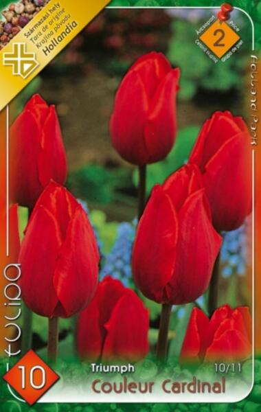 Tulipa Triumph Couleur Cardinal Tulipán virághagymák 2' Virághagyma körmérete: 10/11 cm Javasolt ültetési ideje: Szeptember - December Virágzás ideje: Április Javasolt ültetési távolság: 10 cm Javasolt ültetési mélység kb. : 10 cm Növény várható magassága kb. : 35 cm A Triumph tulipánok 40-50 cm szárhosszúságú, többségében nagy virágú és erõs szárú tulipánok,