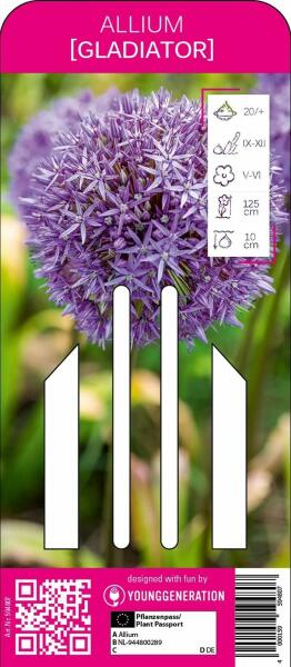 Allium Gladiator díszhagyma virághagyma Virághagyma körmérete: 20/+ cm Növény várható magassága: 125 cm Javasolt ültetési ideje: szeptember-december Virágzás ideje: június-július Vágott virágnak is alkalmas Az Allium 'Gladiator' egy 125 cm magas hagymás növény, amely májusban és júniusban virágzik. A magas virágzati száron hatalmas lila fejecskevirágzatba rendezõdve ny