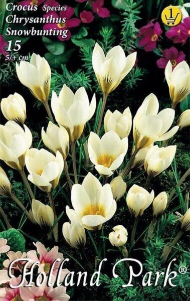 Crocus Species Chrysanthus Snowbunting botanikai krókusz virághagymák Virághagyma körmérete: 5/+ cm Javasolt ültetési ideje: Szeptember - December Virágzás ideje: Február - Március Javasolt ültetési távolság kb. : 8 cm Javasolt ültetési mélység kb. : 8 cm Növény várható magassága kb. : 10 cm A botanikai krókuszok különlegesen szép színekkel díszlõ, igen korai virág