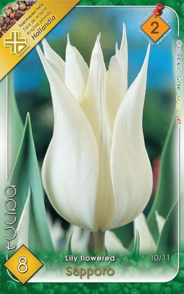 Tulipa Lily flowered Sapporo liliomvirágú tulipán virághagymák Virághagyma körmérete: 10/11 cm Javasolt ültetési ideje: IX. -XII. Virágzás ideje: IV. -V. Javasolt ültetési távolság kb. : 10 cm Javasolt ültetési mélység kb. : 10 cm Növény várható magassága kb. : 55 cm A liliomvirágú tulipánok április-májusban virágzó, rendkívül kecses virágformájú tulipánok. Sz