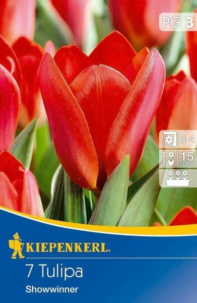 Tulipa Showwinner Kaufmann tulipán virághagymák Virághagyma körmérete: 10/11 cm Növény várható magassága: 15 cm Javasolt ültetési ideje: szeptember-december Virágzás ideje: március-április Balkonládába is ültethetõ Az alacsony szárú, díjnyertes Tulipa Showwinner' - Kaufmanniana tulipán igazi klasszikus tulipánfajta, ami remekül mutat minden tavaszi kertben. Az õszi vi