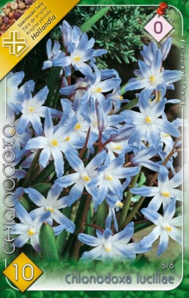 Chionodoxa lucilliae hófény virághagymák Virághagyma körmérete: 5/6 cm Javasolt ültetési ideje: Szeptember - December Virágzás ideje: Március - Április Javasolt ültetési távolság: 8 cm Javasolt ültetési mélység kb. : 8 cm Növény várható magassága kb. : 10 cm A hófény nem kedveli a nyirkos, hideg, kötött talajokat, de ragyogó színével, belülrõl szinte világító