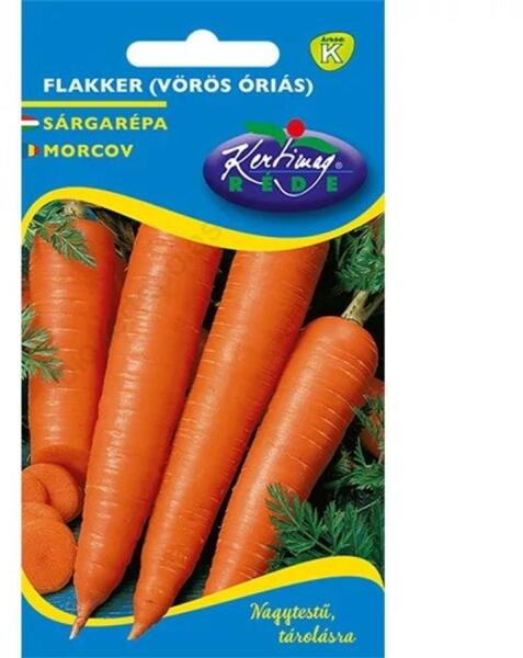Sárgarépa - Vörös Óriás Flakker 5g Kiváló ízű, Flakker típusú, hosszú gyökerű, széles vállú, mélyvörös, sima felületű sárgarépa. Nagy, erőteljes lombozatú, hosszú tenyészidejű fajta (180-200 nap). Kiváló íze mellett magas B1-, B2-, B6- és C vitamin tartalma, valamint kimondottan jó tárolhatósága miatt nagyon közkedvelt fajta. Magas karotin-, cukor- és szára