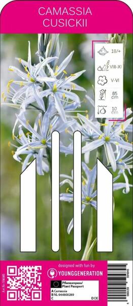 Camassia cusickii prérigyertya virághagyma A Young Generation prérililiom májustól júniusig virágzik, és ez idõ alatt mutatja meg filigrán, finom kék szirmait hosszú, keskeny formában. Ez a virágszépség eléri a kb. 65 cm-es magasságot és kiváló benyomást kelt szólistaként és csoportosan is. A prérililiom jól honosodik, és népszerű nektár- és pollenforrás a táplál